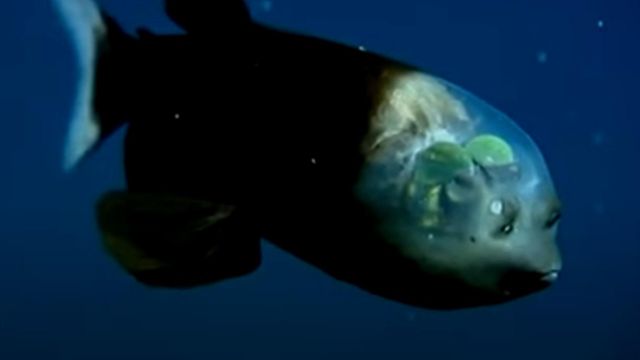 Y, donde tiene dos pequeñas hendiduras que donde un pez suele tener los ojos, son en realidad los órganos olfativos del pez barreleye. Este tipo de pez se alimenta de zooplancton, crustáceos o sifonóforos.