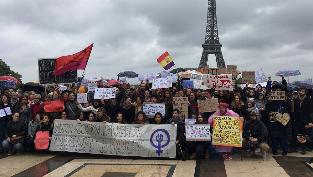 "No es abuso, es violación", gritaron los integrantes, la mayor parte de origen español, que se reunieron en una lluviosa mañana en la explanada del Trocadero, frente al famoso monumento parisiense. Tras una pancarta en la que se podía leer "Ante la justicia patriarcal, autodefensa feminista", los asistentes corearon lemas en contra de una sentencia que consideran "injusta".