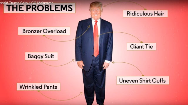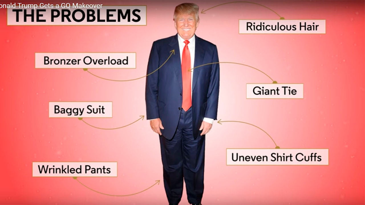 A través de un vídeo, GQ la publicación recomienda a Trump cambiar el estilo de sus pantalones por uno más estrecho, la corbata también por una más estrecha, hacer parecer que se vean sus manos más grandes, un tono de bronceado más claro y de pelo más oscuro... tras todo esto el resultado sería el siguiente.