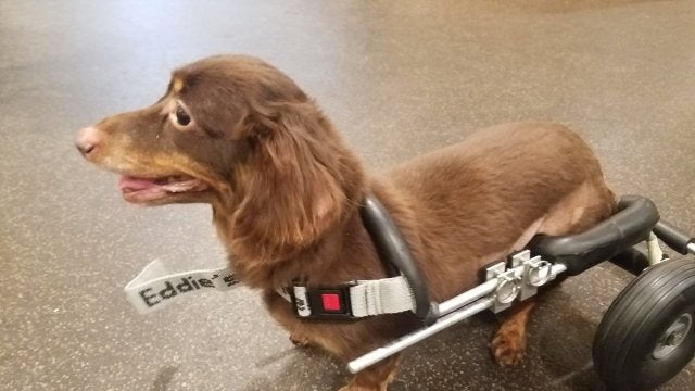 Frances fue encontrada en una bolsa de basura con una lesión en la espina dorsal que le impedía andar. Ahora, el pequeño perro salchicha no solo tiene una silla de ruedas, sino que ha encontrado un hogar, donde compartirá juegos con otros dos perros.