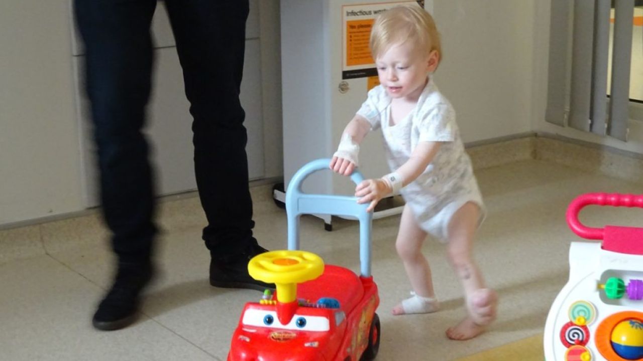 El pequeño, de 15 meses, sufre un raro tumor nervioso que provocó que su pierna izquierda se deformara y los médicos tuvieran que amputarla. Sus padres, cuando estaban en el hospital de Mánchester con él, grabaron un vídeo en el que se le ve dando sus primeros pasos agarrado a una especie de 'tacatá'.