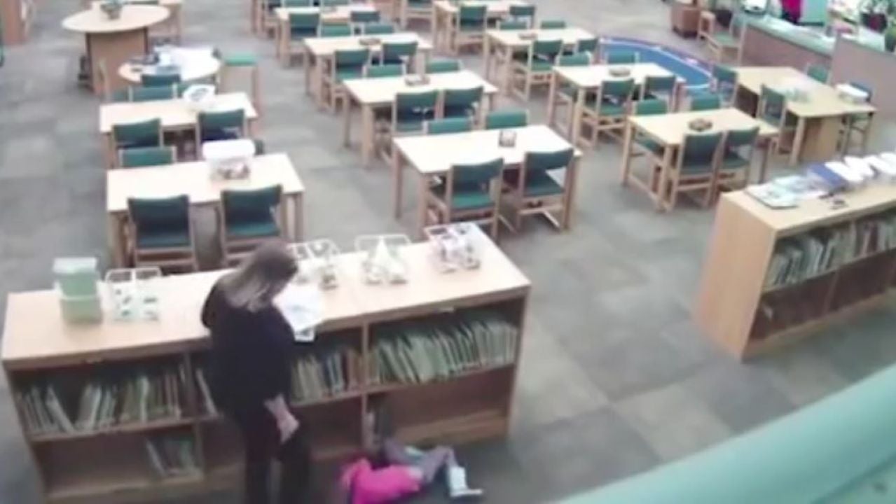 En las imágenes se puede ver a la niña tirada en el suelo de una biblioteca antes de meterse en una de las estanterías. En ese momento la profesora saca a la pequeña de ahí y la deja de nuevo en el suelo.