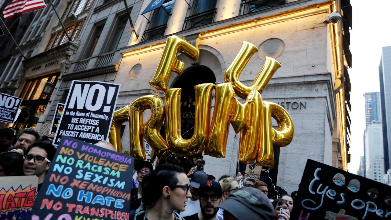 Los manifestantes, de diversos orígenes y edades, comenzaron a congregarse en Manhattan horas antes de la llegada del presidente, coreando consignas como "No KKK, No Fascist USA!" ("No al KKK (Ku Kus Klan), no a unos EE.UU. fascistas", en español).
