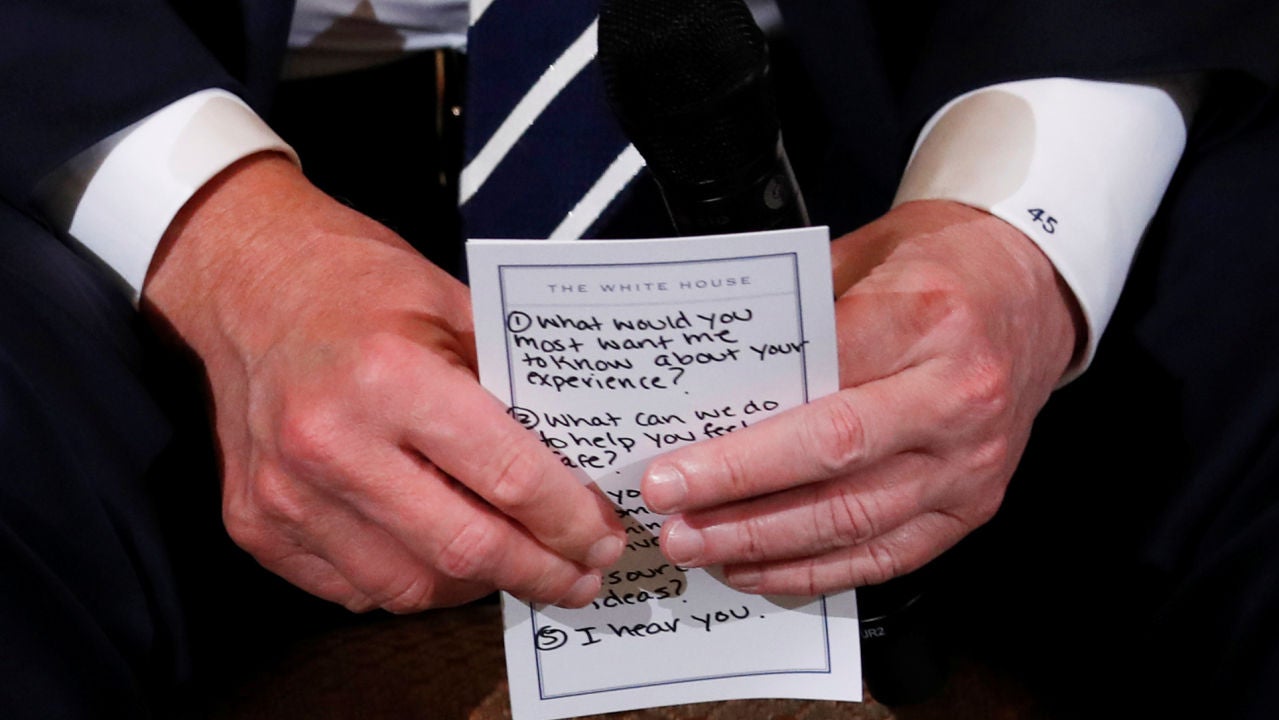 El presidente quería escuchar a los alumnos y sus ideas sobre cómo reforzar la seguridad en las escuelas. Para que sus intervenciones resultases empáticas y demostrasen su preocupación por el tema, Trump se guió de una serie de anotaciones que llevaba preparadas.