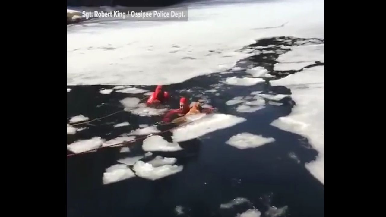 Dos bomberos se lanzan a un lago helado para salvar a un perro que quedó atrapado en el agua