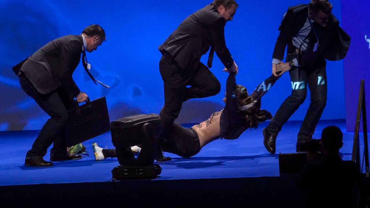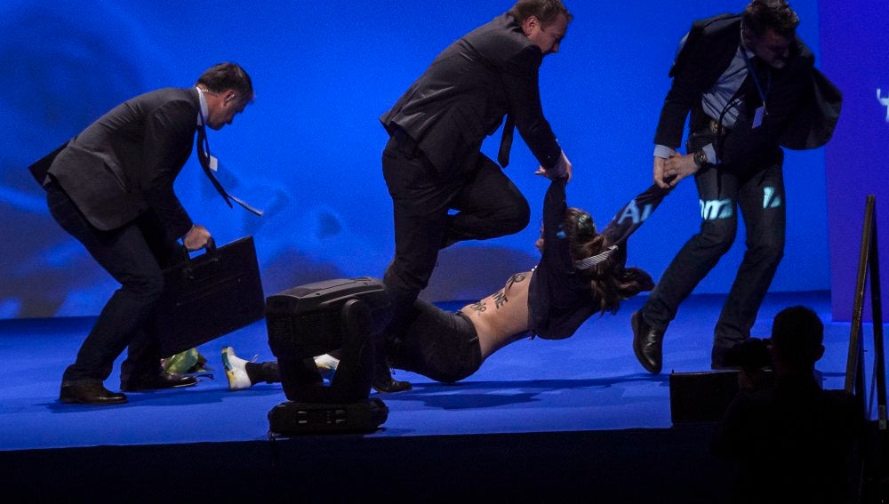 La primera de ellas saltó al escenario en el que pronunciaba su discurso Marine Le Pen con un ramo de flores. Minutos más tarde, otra mujer saltó al estrado en el que estaban las cámaras de televisión, lo que obligó a la aspirante a parar de nuevo.