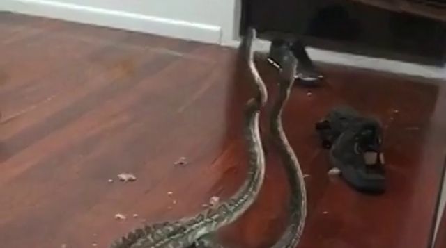 Las serpientes comenzaron la pelea en el interior del sistema de la ventilación, pero sus movimientos fueron tan bruscos que rompieron el techo y cayeron al suelo de una habitación, donde siguió el combate