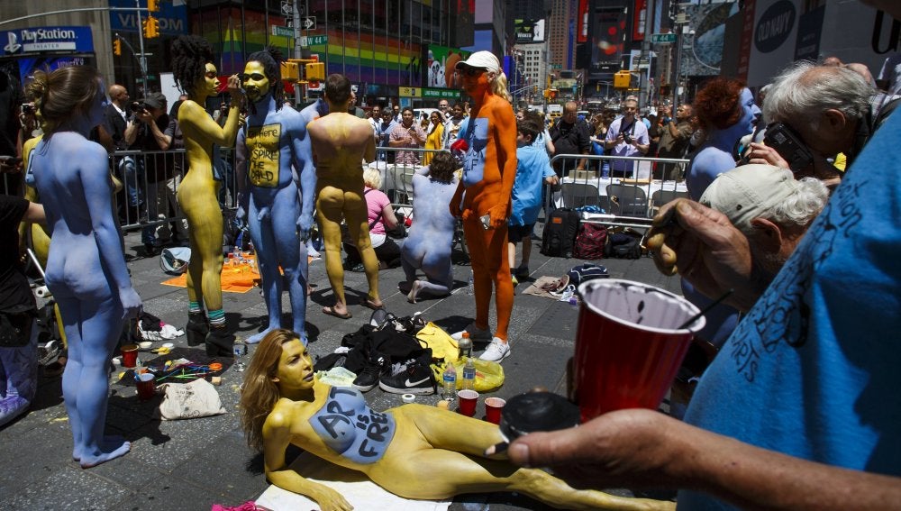 "Se puede apreciar el voyeurismo estadounidense", bromeó. A tan solo unos metros de la muestra, que avisaba en un cartel sobre sus escenas de nudismo, un coche de policía y agentes armados vigilaban el concurrido enclave, escenario de un múltiple atropello hace menos de un mes. "Qué contraste", comentó al pasar junto a ellos uno de los modelos nudistas, con el mensaje "el color no importa" pintado sobre el pecho.