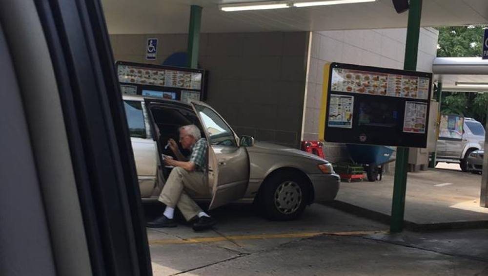 Se trata de una imagen en la que se puede ver a un anciano sentado al lado del copiloto de su coche dando de comer a una mujer. Según cuenta Brent Kelly, quien ha compartido la fotografía, paró en una tienda para comprar un helado para él y sus hijos porque hacía mucho calor.