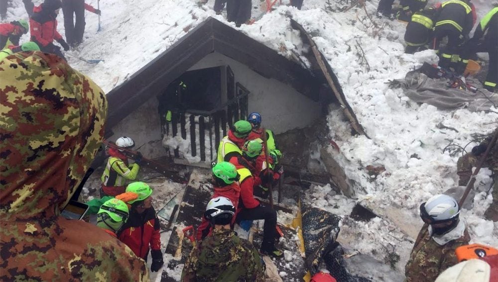 Las labores de búsqueda de posibles supervivientes continúan sin descanso con la participación de unos 150 efectivos, entre militares, bomberos, policías y trabajadores de la Cruz Roja y del Servicio Alpino, que se alternan en turnos. La esperanza de los equipos de rescate es llegar al centro del hotel, donde se encontraba la zona del bar y donde se cree que podrían haberse concentrado algunos de los huéspedes que están aún desaparecidos.