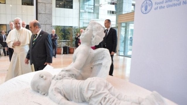 El Pontífice ha donado a la organización internacional la figura escultórica de 1,20 metros de ancho y 0,75 de alto, esculpida en mármol blanco de Carrara, con un peso aproximado de 1.000 kilos. La obra del artista autodidacta Luigi Prevedel (Cles, Trento. 1969) ha sido colocada en el atrio principal de la sede de la FAO en Roma, Italia.