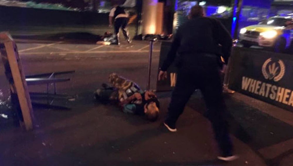 Una imagen difundida por BBC y Telegraph y captada por el fotógrafoGabriele Sciotto muestra el cuerpo de un supuesto atacante tumbado en el suelo y también se vería a otra persona abatida más atrás.