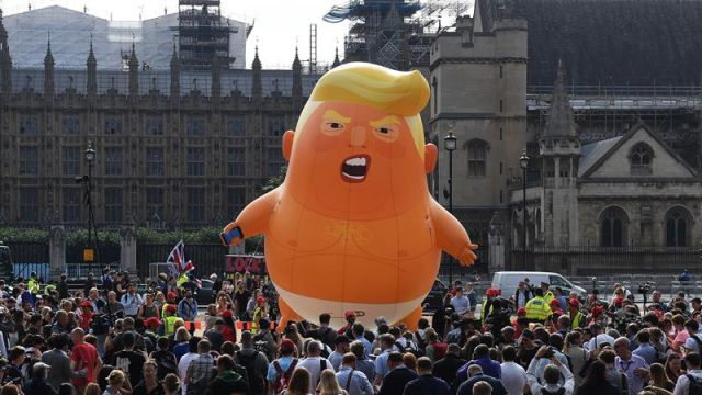 El globo gigante de un "bebé Trump" en pañales y sujetando un móvil se alzó hoy enfrente del Parlamento de Londres, como parte de las protestas por la primera visita oficial al Reino Unido del presidente estadounidense, Donald Trump. El inflable fue erigido por un grupo de manifestantes entre la euforia de la multitud congregada y se espera que flote en la plaza del Parlamento, colindante al emblemático edificio neogótico, durante las próximas dos horas.