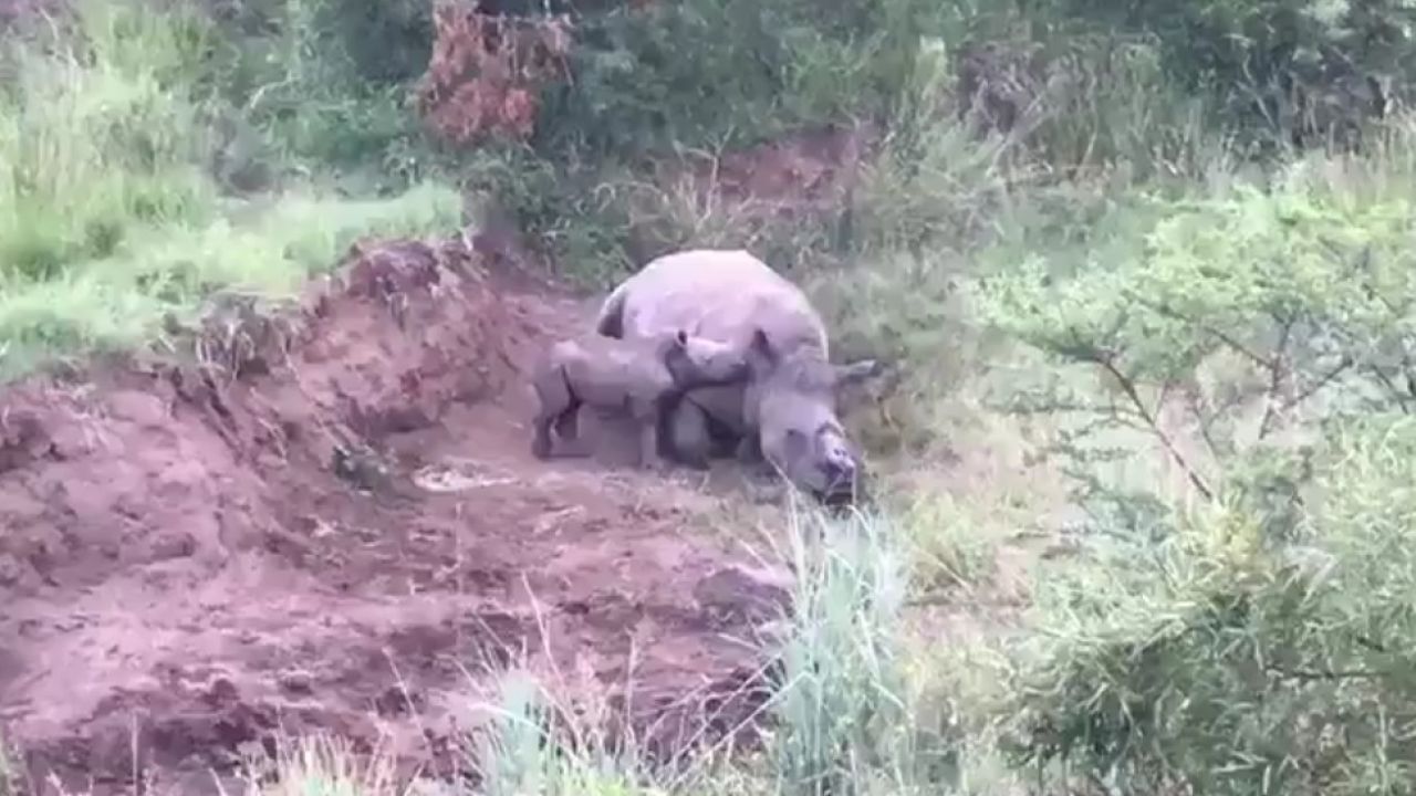 Con tan solo un mes de vida, el animal trata -en vano- de obtener leche del cuerpo de su madre. Según indican desde la asociación Rhino 911, la madre había muerto pocas horas antes y el animal no entendía la situación, por lo que trató de alimentarse sin éxito.
