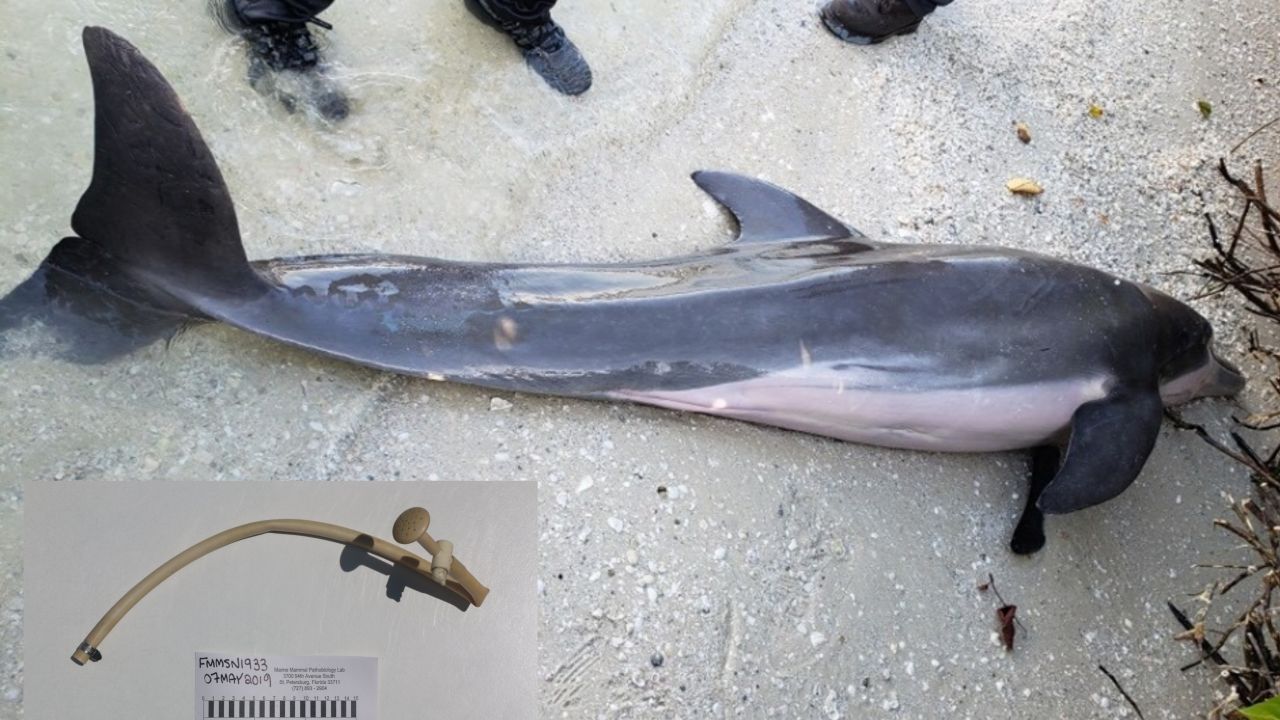 La manguera parece ser de una ducha en un barco. El delfín fue encontrado en la playa de Fort Myers en Big Carlos Pass y se trata del segundo hallazgo inquietante en el estómago de un delfín en el área en el último mes.