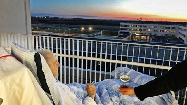 El anciano pudo disfrutar en su habitación del hospital de una copa de vino blanco y un cigarro mientras veía el atardecer .