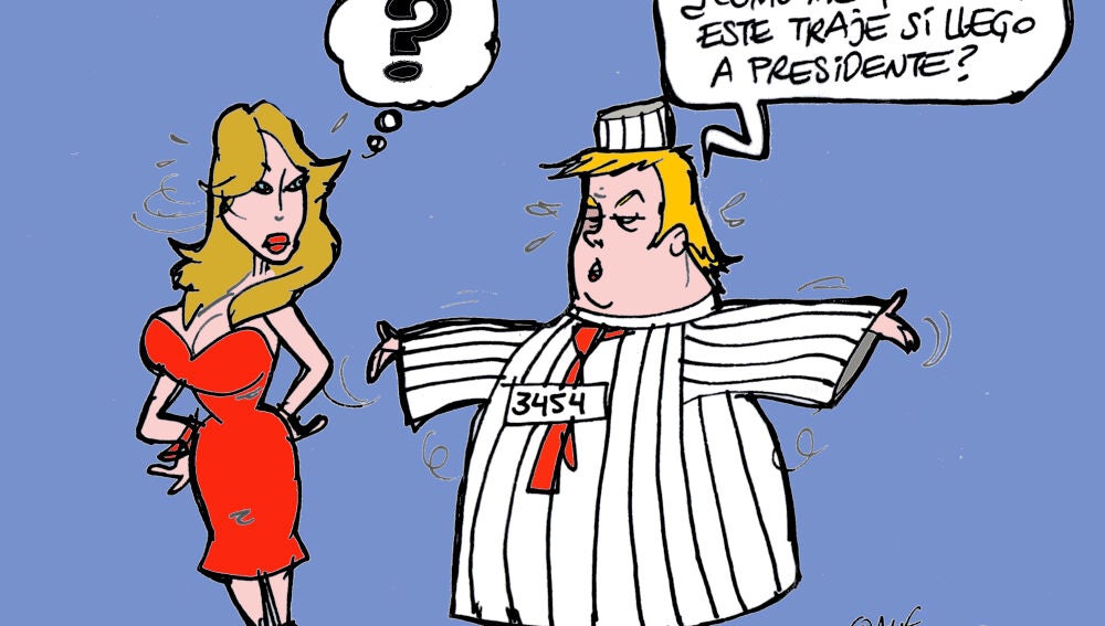 El ilustrador Alfredo Boto Hervás ha plasmado en la viñeta de la semana la situación que enfrenta en estos momentos el expresidente de Estados Unidos por múltiples cargos federales. En la viñeta se ve al propio Trump hablando con su mujer Melania, a la que le pregunta por su futuro. "Sólo por curiosidad, ¿cómo me quedaría este traje si llego a presidente?", pregunta el exdirigente.
