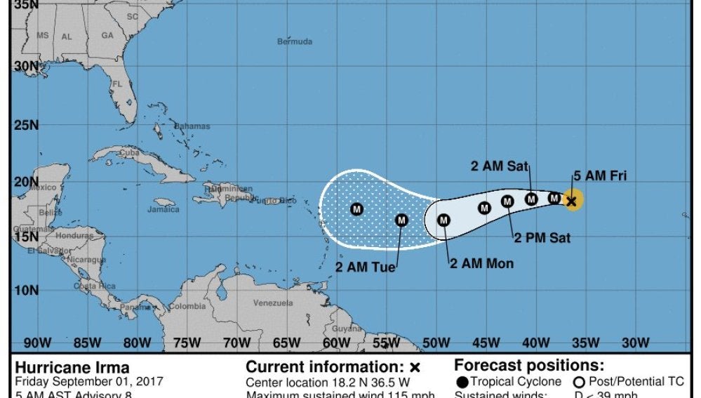 'Irma' se fortaleció en su ruta hacia el Caribe y ha vuelto a categoría 3 con vientos máximos sostenidos de 120 millas por hora (195 km/h), y se espera que permanezca como "un poderoso huracán", informó el Centro Nacional de Huracanes (CNH) de EEUU En su boletín de las 21.00 GMT, el CNH indicó que 'Irma', el cuarto huracán de la temporada ciclónica en la cuenca atlántica, se encuentra a 2.405 kilómetros al este de las islas de Sotavento (Antillas Menores).