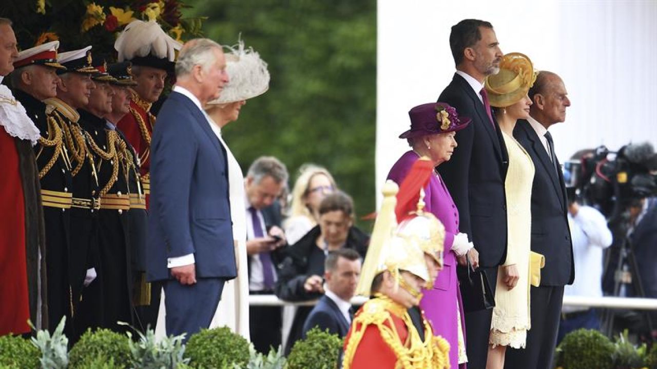 Acompañados por el príncipe Carlos y su esposa, la duquesa de Cornualles, desde el hotel donde se alojaron anoche tras su llegada a Londres, Felipe VI y la reina Letizia se encontraron con sus anfitriones en el recinto de ceremonias de Horse Guards Parade, próximo a Trafalgar Square, Felipe VI besó protocolariamente la mano de Isabel II y completó el saludo con un cariñoso beso en la mejilla, mientras que doña Letizia -que llevaba un vestido de seda amarillo limón diseñado por Felipe Varela- estrechó sonriente la mano de sus anfitriones, antes de intercambiar unas primeras palabras con la soberana británica mientras el Rey pasaba revista a las tropas con el duque.