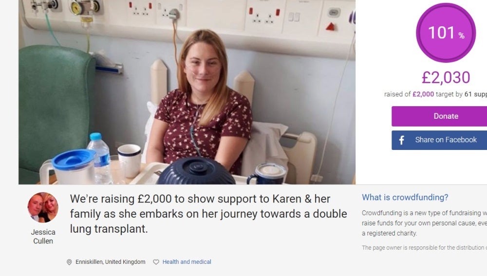Aunque Karen ha sido diagnosticada, al igual que su hermana cada día se debilita más. Sus pulmones se han endurecido, dificultando la respiración, por lo que necesita oxígeno las 24 horas del día. Karen está ahora en la lista de trasplantes, y para cuando llegue el momento tendrá que ir a Newcastle durante seis semanas para operarse y recuperarse. Por ello, amigos y familiares han creado una página de crowdfunding para apoyarla. "Esta página es para que todos los amigos y familiares de Karen muestren su amor y apoyo a una niña que sin duda lo es”, se puede leer en la publicación.