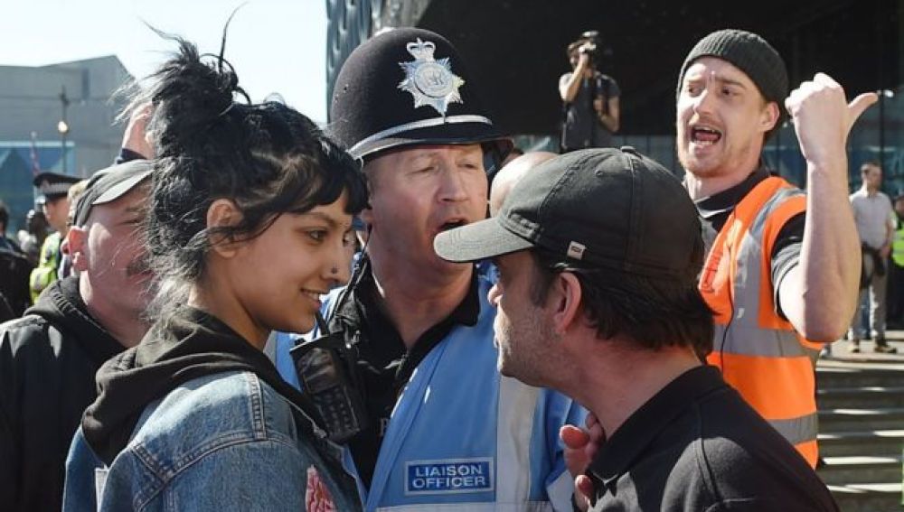 La foto de una mujer sonriendo y plantando cara a un manifestante de extrema derecha del English Defence League (EDL) en Birmingham ha dado la vuelta al mundo. La fotografía fue tomada durante una manifestación convocada el pasado sábado por el propio grupo ultraderechista tras el atentado de Londres y ha sido compartida miles de veces.