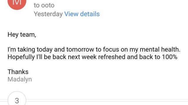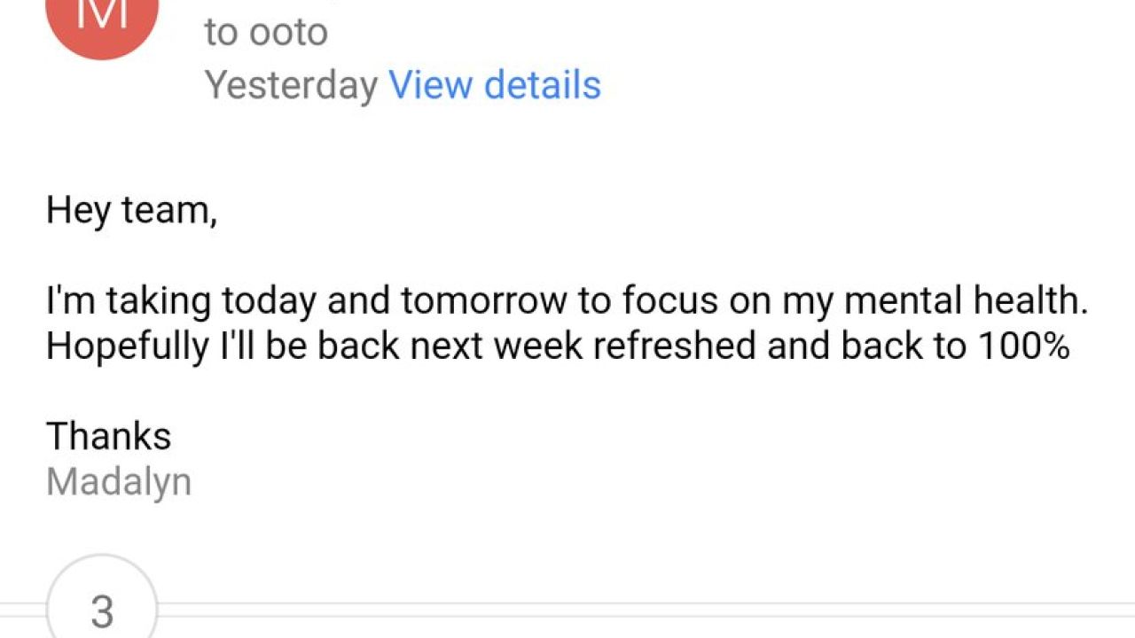 "Hola equipo. Me tomo libres hoy y mañana para centrarme en mi salud mental. Espero regresar la semana que viene descansada y al cien por cien", decía la joven en su correo electrónico.