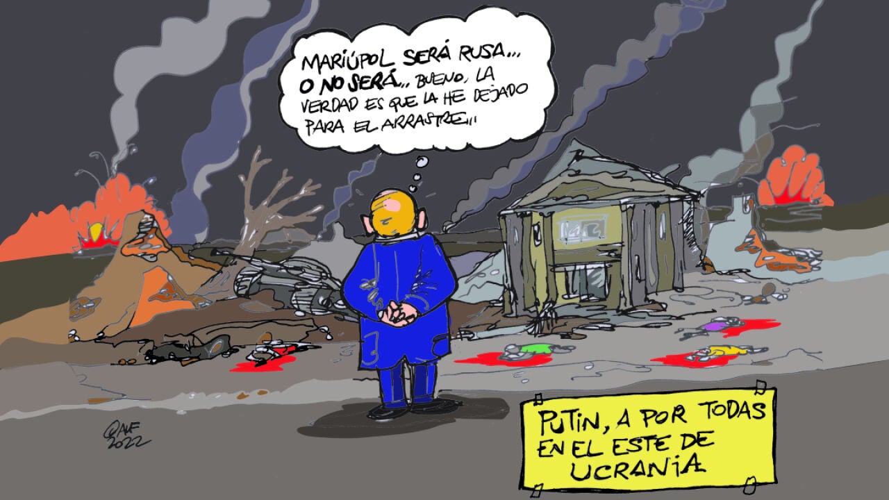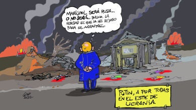 La viñeta gráfica se centra en la situación de la ciudad, devastada: "Mariúpol será rusa o no será...".