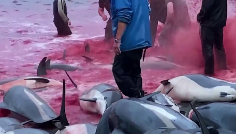 No es la primera vez que el mar se tiñe de color rojo como consecuencia de la muerte de los animales. La entidad internacional ha explicado que la captura de los cetáceos consiste en asustarlos en mar abierto con varias embarcaciones hasta confinarlos en un puerto o cala donde llevan a cabo la masacre mediante hachas y palos.