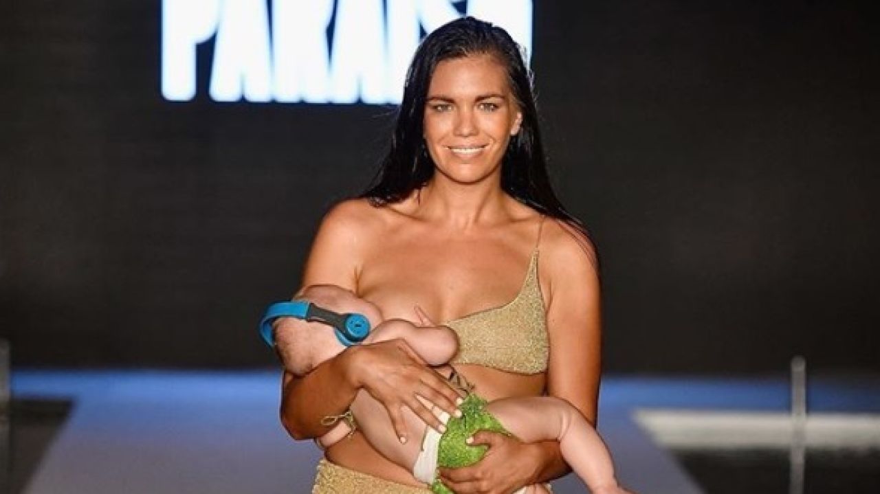 Una modelo de Sport Illustrated ha sido muy aplaudida por desfilar amamantando a su hija sobre la pasarela en Florida. Mara Martin, vestida con un brillante bikini dorado, paseaba sin esfuerzo por la pista acunando a Aria, de cinco meses.