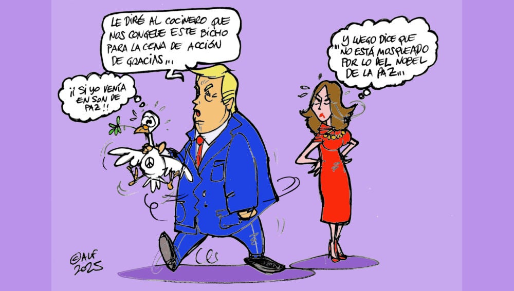 Ese 'interés' de Trump ha quedado reflejado en la viñeta gráfica semanal de nuestro compañero de Antena 3 Noticias Alfredo Boto-Hervás. En ella, el presidente estadounidense aparece diciendo "le diré al cocinero que nos congele este bicho para la cena de Acción de Gracias". El 'bicho' en cuestión es una paloma blanca con una rama de olivo, precisamente el símbolo más reconocido a nivel mundial de la paz. "¡¡Si yo venía en son de paz!!", exclama la paloma. "Y luego dice que no está mosqueado por lo del Nobel de la Paz", comentan alrededor.