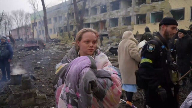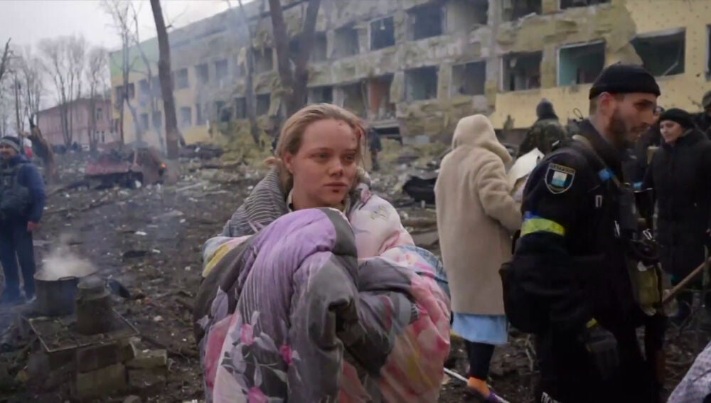 En la imagen se ve a la joven saliendo de lo que quedaba del hospital embarazada y ensangrentada. La joven dio a luz después, la noche del jueves, según la periodista Olga Tokariuk. La niña recibió el nombre de Veronika.