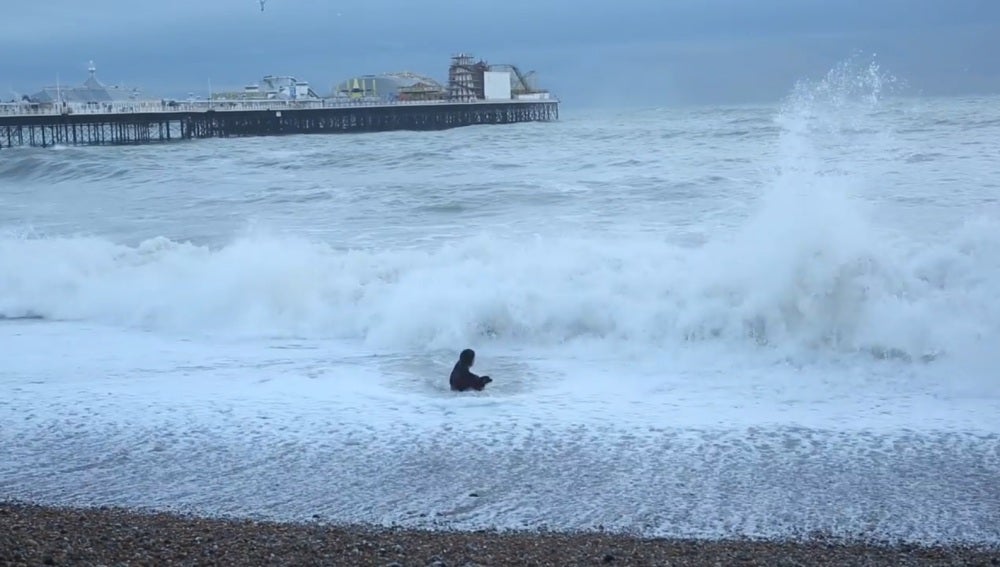 Una mujer fue captada lanzándose a las aguas heladas de Brighton, Reino Unido, para salvar a su perro. La fuerte marea y las altas olas casi acaban con su vida.