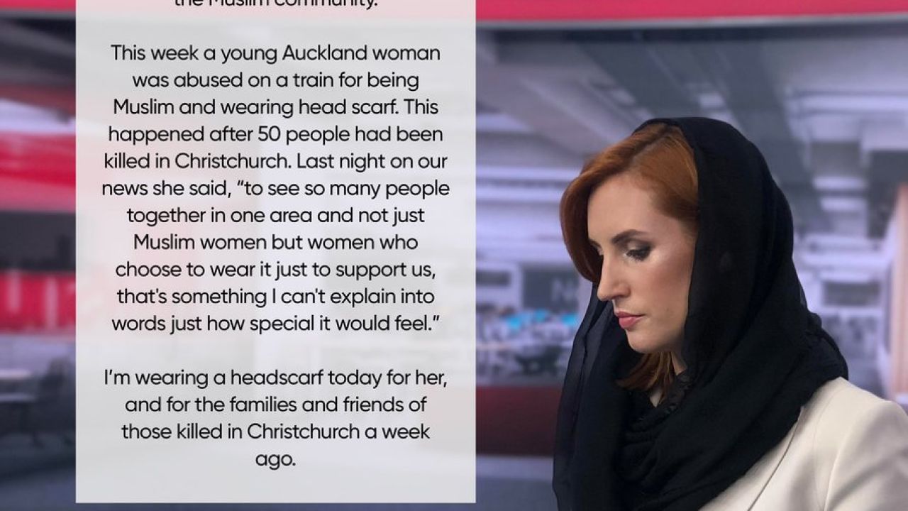 "Opté por usar un velo en el estudio en solidaridad con la comunidad musulmana. Esta semana una joven de Auckland fue agredida en un tren por ser musulmana y usar un velo. Esto sucedió después de que 50 personas fueron asesinadas en Christchuch", dijo Samantha Hayes, presentadora de NewsHub, en un tuit.