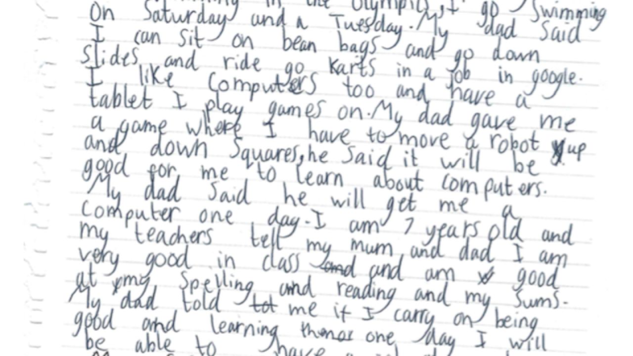 Mi padre dice que me dará un ordenador un día. Tengo siete años y mis profesores le han dicho a mi madre y mi padre que soy muy buena en clase y que soy muy buena en el deletreo, leyendo y en las sumas.