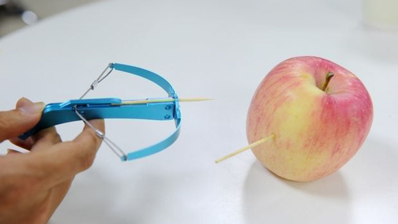 La miniballesta está diseñada para lanzar palillos, pero su mecanismo permite introducir agujas y clavos que pueden hacer del juguete un peligroso artefacto capaz de romper cristales.