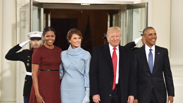 Barack Obama y su esposa, Michelle, aguardaron al matrimonio Trump, que llegó en un vehículo blindado negro, en la entrada de la Casa Blanca. Los dos matrimonios dialogaron brevemente y posaron para las cámaras antes de entrar a la Casa Blanca. Se les vio a todos sonrientes, Trump con una corbata roja y Obama en tonos azules. Melania, quien entregó a los Obama un regalo, lleva un vestido de dos piezas de Ralph Lauren en tono azul claro, con guantes y zapatos de tacón a juego, y el cabello recogido en un estilo que recordaba a la fallecida primera dama Jackie Kennedy.