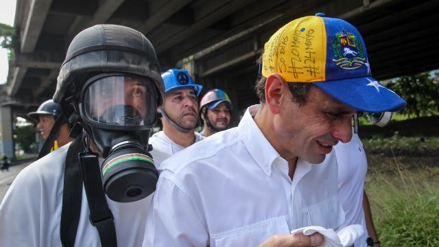 Afirmó además que los efectivos de la GNB dispararon perdigones contra los acompañantes de Capriles lo que ocasionó una herida abierta a uno de ellos y que un fotógrafo fue golpeado en el torso con la parte de atrás de una escopeta. Antes, el gobernador y dos veces candidato presidencial había resultado afectado por los gases lacrimógenos que lanzaron los efectivos de la fuerza pública contra una movilización opositora que fue dispersada en la autopista Francisco Fajardo, la principal arteria vial de la capital venezolana.