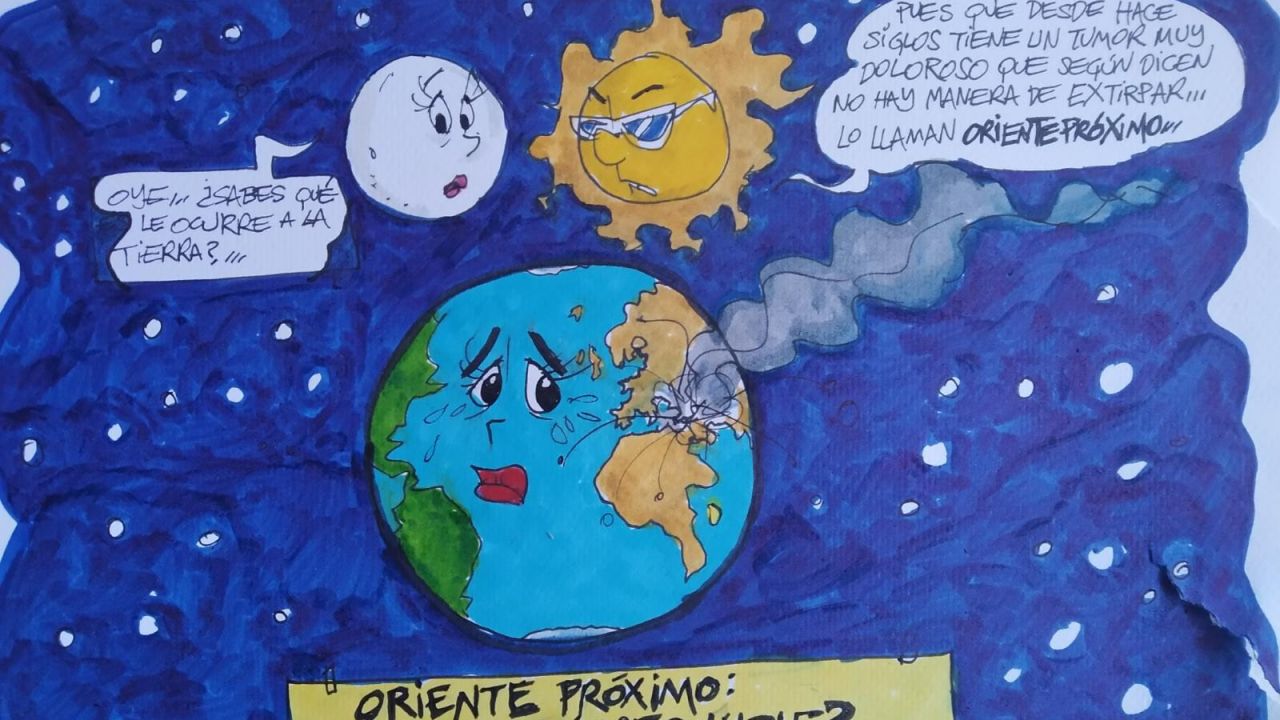La viñeta de Alfredo Boto-Hervás muestra al Sol y la Luna 'preocupados' por la situación en la Tierra. "Oye, ¿sabes qué le ocurre a la Tierra?", se pregunta la Luna, a lo que el Sol responde: "Pues que desde hace siglos tiene un tumor muy doloroso que, según dice, no hay manera de extirpar... Lo llaman Oriente Próximo".