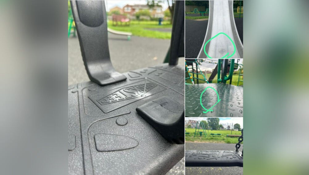 Los padres están "horrorizados" después de que hayan aparecido clavos pegados a los columpios y a un tobogán de un parque infantil. Afortunadamente, ningún niño resultó herido, detalla el 'Daily Mail'.