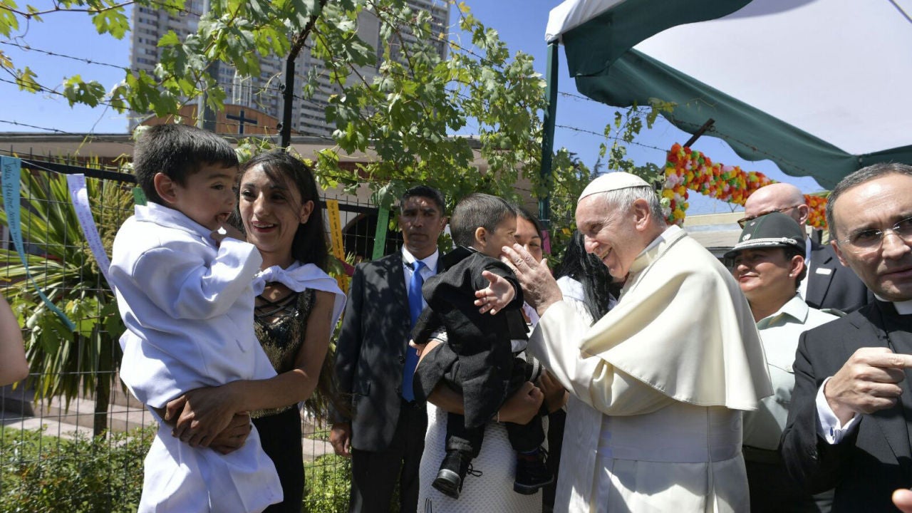 A su llegada a este acto de su primera jornada de visita a Chile, varias mujeres con sus hijos pequeños, con quienes viven en la cárcel, recibieron al Papa argentino. Una embarazada pidió que le bendijese al niño, que se llamará Lucas y que nacerá en la cárcel, y con todas ellas se detuvo durante unos segundos para escucharlas. Después, en el gimnasio de este centro penitenciario, decorado por las reclusas con flores y grullas de papel, que simbolizan la esperanza, y tiras de colores con las palabras de Francisco sobre las prisiones, el pontífice fue besando y abrazando a todos los hijos de las mujeres presentes.