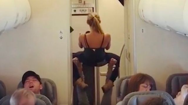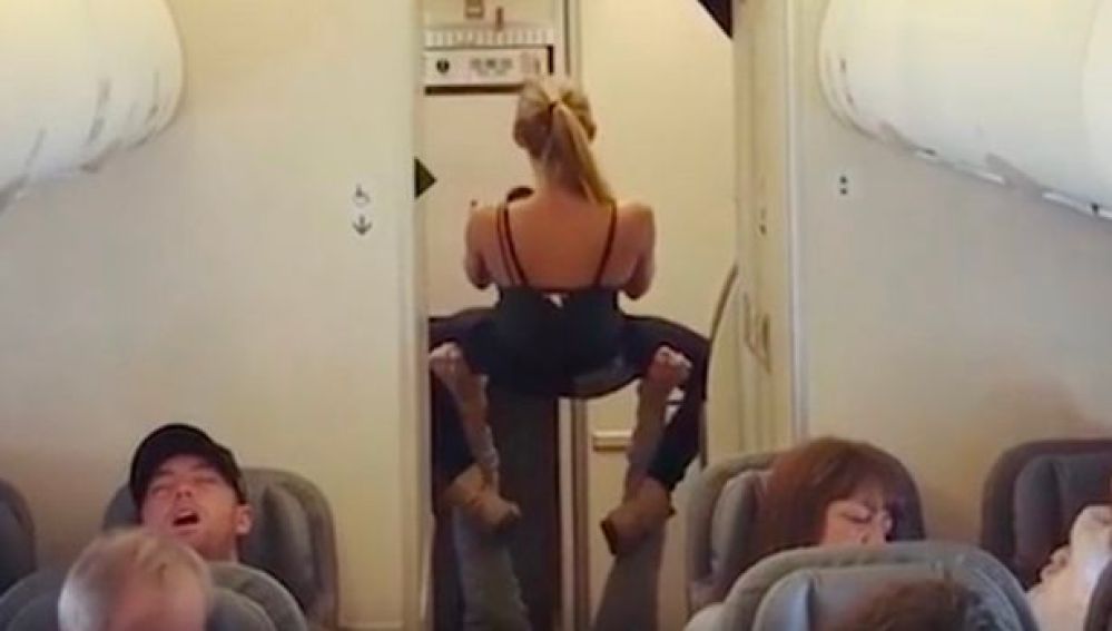 Una pareja de aficionados al 'fitness' decidieron practicar algunas posturas de yoga en la parte trasera de un avión mientras estaban en pleno vuelo.