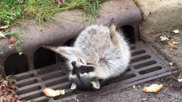 Un mapache se quedó atrapado en un alcantarilla y tuvo que ser rescatado por la Policía. Había metido su cuerpo a través de la rejilla de la alcantarilla para comer pero cuando terminó de engullir la comida, no le resultó tan fácil salir. De hecho, tuvo que se ayudado.