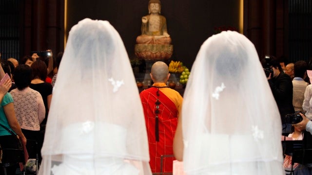 Frente a una estatua dorada de Buda, You Ya-ting y Fish Huang, ambas de 30 años, se han prometido amor eterno bajo el testimonio de la maestra budista Shi Zhao-hui.