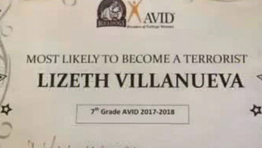 Lizeth Villanueva, una niña de 13 años estudiante de séptimo grado en Texas, es una estudiante que ha estado en el programa de honor académica de su escuela por dos años, saca notas y nunca ha sido problemática, pero sus profesores han decidido darle el premio a 'la más propensa para convertirse en terrorista'.