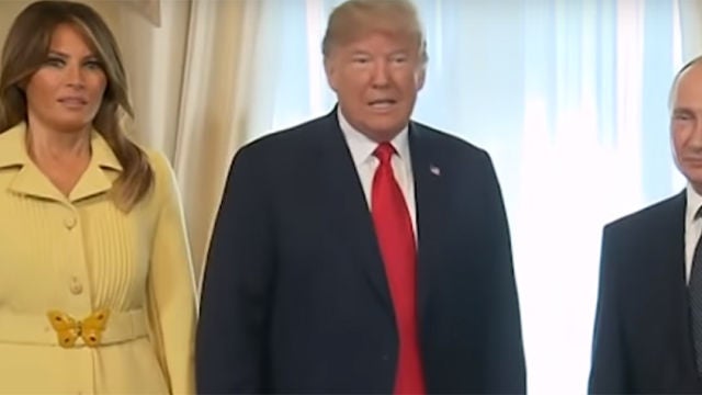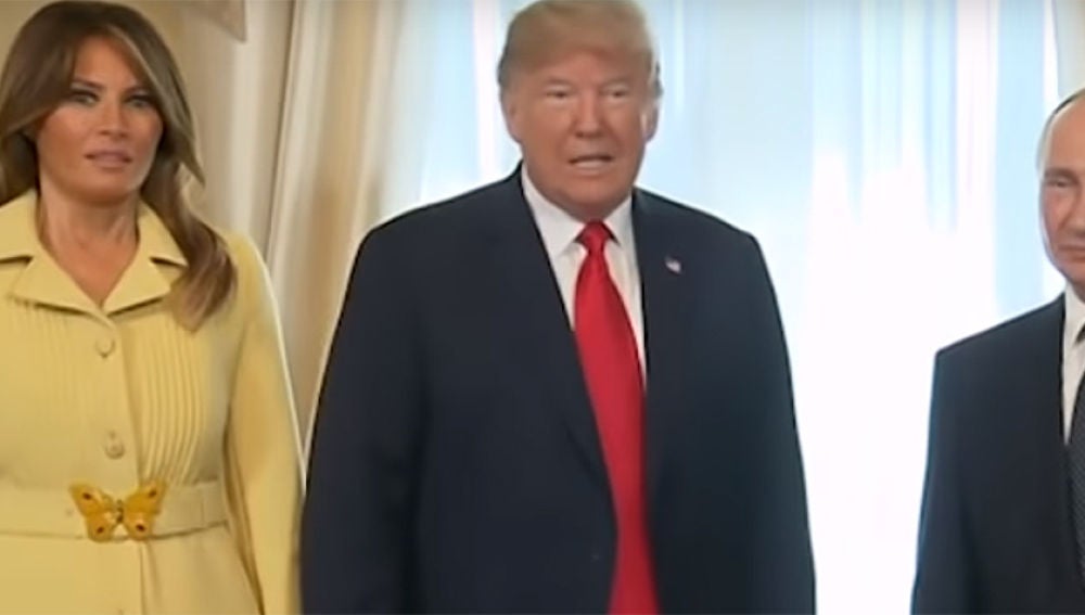 La primera dama estadounidense también saludó al mandatario ruso. Durante el apretón de manos se puede ver cómo Melania Trump intercambia unas palabras con Vladimir Putin, pero lo sorprendente es el gesto de la mujer de Trump cuando se gira para posar para la foto oficial. Su rostro muestra una mueca en la que muchos usuarios de Twitter ven una expresión de pánico.