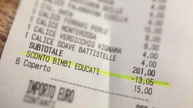 Antonio Ferrari es el propietario de la homónima vinoteca de Padova, que el pasado domingo hizo un ''descuento por niños educados'' a un grupo de clientes. Eran seis adultos y cinco niños. Lo pensó después de haber visto ''el espectáculo'' de los niños que, después de terminar de comer, mientras los mayores seguían de sobremesa, pasaron todo el tiempo tranquilos haciendo cálculos y coloreando hojas que habían traído de su casa. Además, en esa mesa no había ninguna tablet: sólo bolígrafos, marcadores y hojas. Les descontó 13 euros de su factura.