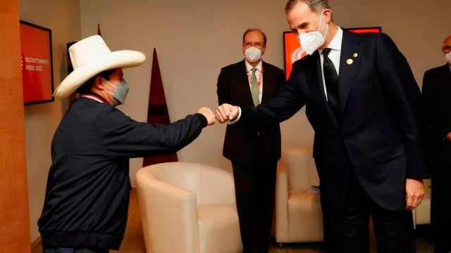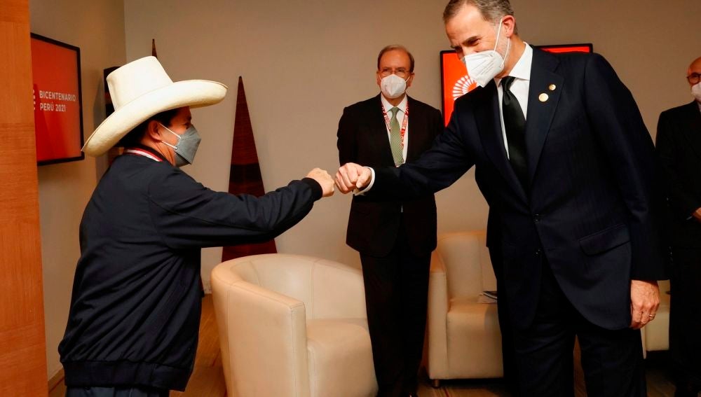 El rey Felipe VI se ha reunido con presidente electo de Perú, Pedro Castillo. La reunión se mantenía en el Centro de Convenciones de Lima horas antes de que asumiera la jefatura del Estado hasta 2026.