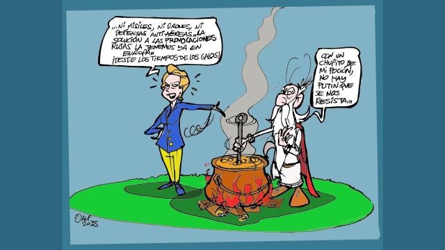 Con un caldero al fuego, la dirigente europea sostiene que no hacen falta "ni misiles, ni drones, ni defensas antiaéreas", porque Europa ya tiene la solución a las provocaciones rusas "desde los tiempos de los galos". Ante esto, el druida responde con ironía: "Con un chupito de mi poción, no hay Putin que se nos resista". De esta manera, refleja dificultad de Europa de dar una respuesta clara y contundente frente a la presión del Kremlin en el marco de la guerra de Ucrania.