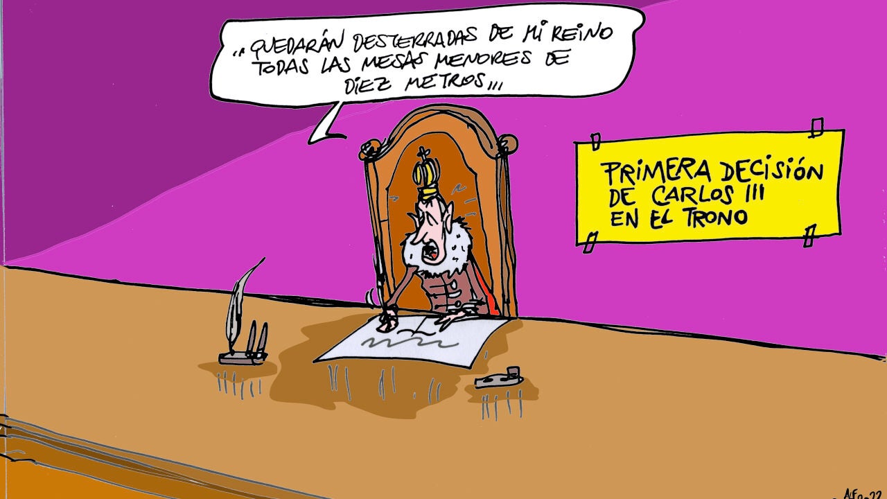Esta semana, el ilustrador de Antena 3 Alfredo Boto-Hervás ha dedicado su viñeta, la número 191, a este tema. En la imagen se puede ver a Carlos III, sentado en su escritorio, vestido de Rey y escribiendo su "primera decisión": "Quedarán desterradas de mi reino todas las mesas menores de 10 metros".