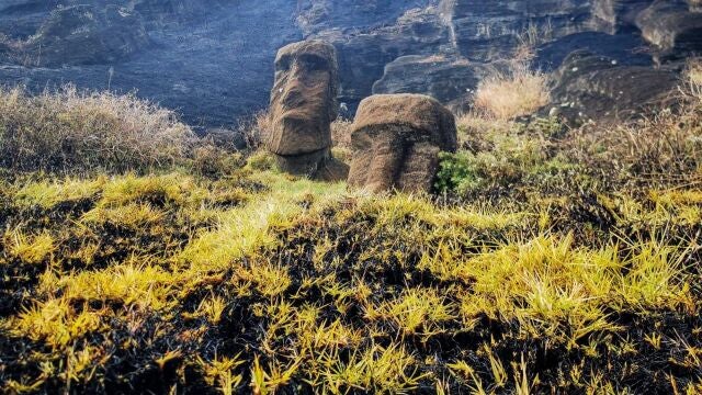 Un incendio que calcinó cerca de 60 hectáreas ha destruido megalitos 'moái' tallados por una tribu polinesia hace más de 500 años.